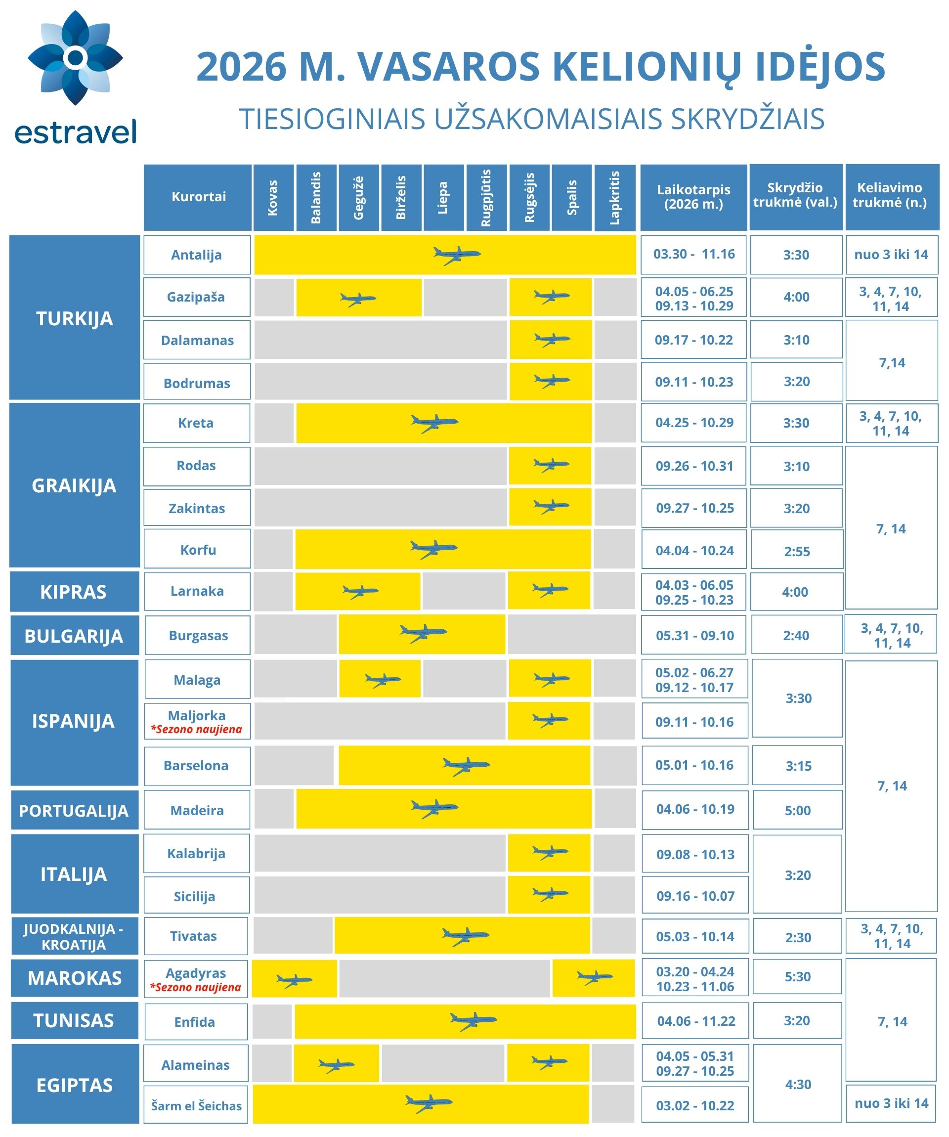 Keliones į visas kalendoriuje nurodytas šalis ir kurortus galite užsakyti Estravel. Kalendoriuje rasite tiesioginių užsakomųjų skrydžių kryptis, jų trukmes ir keliavimo laikotarpius. Išsirinkti sau atostogas dar nebuvo taip lengva! Kviečiame keliauti – išsirinkę kelionių kryptį tiesioginiu užsakomuoju skrydžiu, siųskite užklausą Estravel komandai arba skambinkite tel. nr.: +370 5 212 5805.